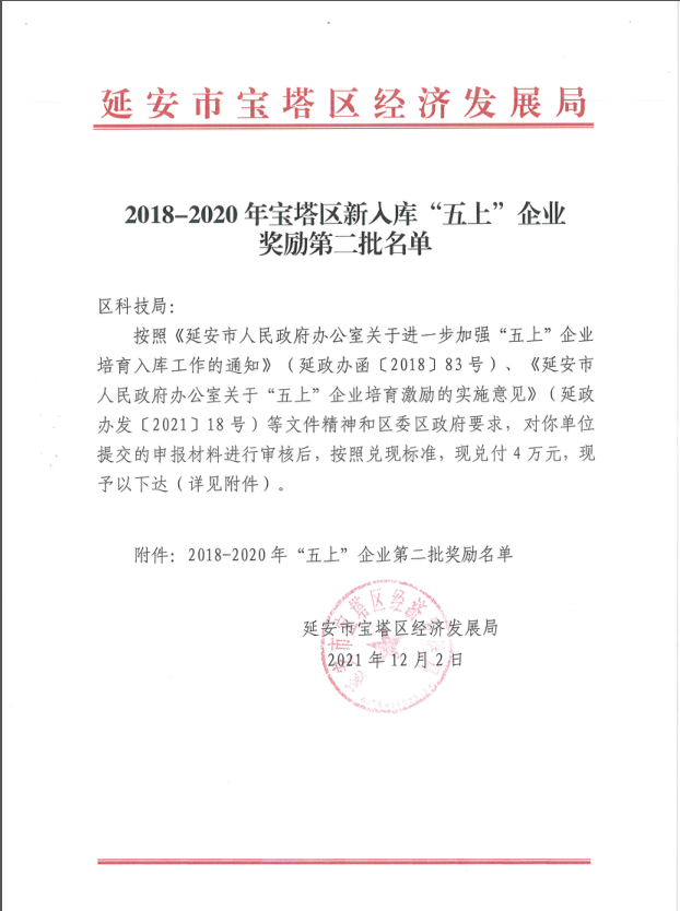 本網訊: 國之經濟,至關重要,應國家經濟發展需求,為確保實現和全國一道于2020年全面建成小康社會目標,祥瑞公司積極提交“五上企業”申報資料, 在黨的扶持政策下,升級、提升、增效,為本市的經濟發展貢獻力量,經濟是提高人民群眾生活的重要保障,祥瑞公司將孜孜不倦,奮發向前,積極配合政府。為延安的經濟發展盡自己的綿薄之力。